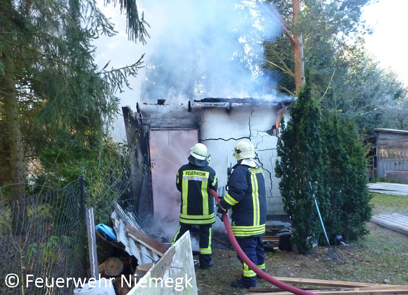 Aus bisher ungeklärter Ursache brannte in einer Wochenendhaussiedlung ein Schuppen (ca. 3 x 4 m) in voller Ausdehnung. Die Rauchsäule war bereits auf der Anfahrt weit sichtbar.
