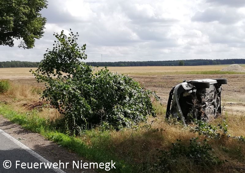 Aus ungeklärter Ursache war ein Pkw Peugeot nach links von der Straße abgekommen und gegen einen Baum geprallt. In der Folge kippte das Fahrzeug auf die Seite. Der alarmierte daraufhin selbst die Rettungskräfte. Er wurde später leicht verletzt in ein Krankenhaus gebracht.