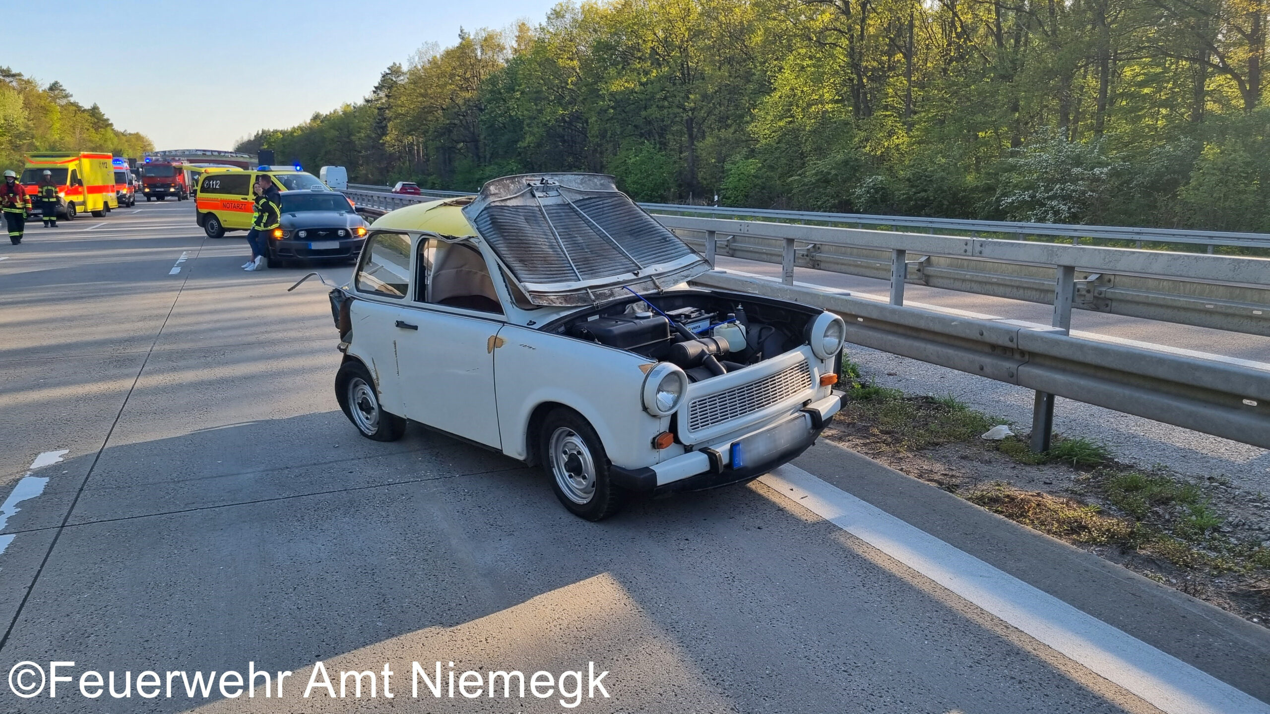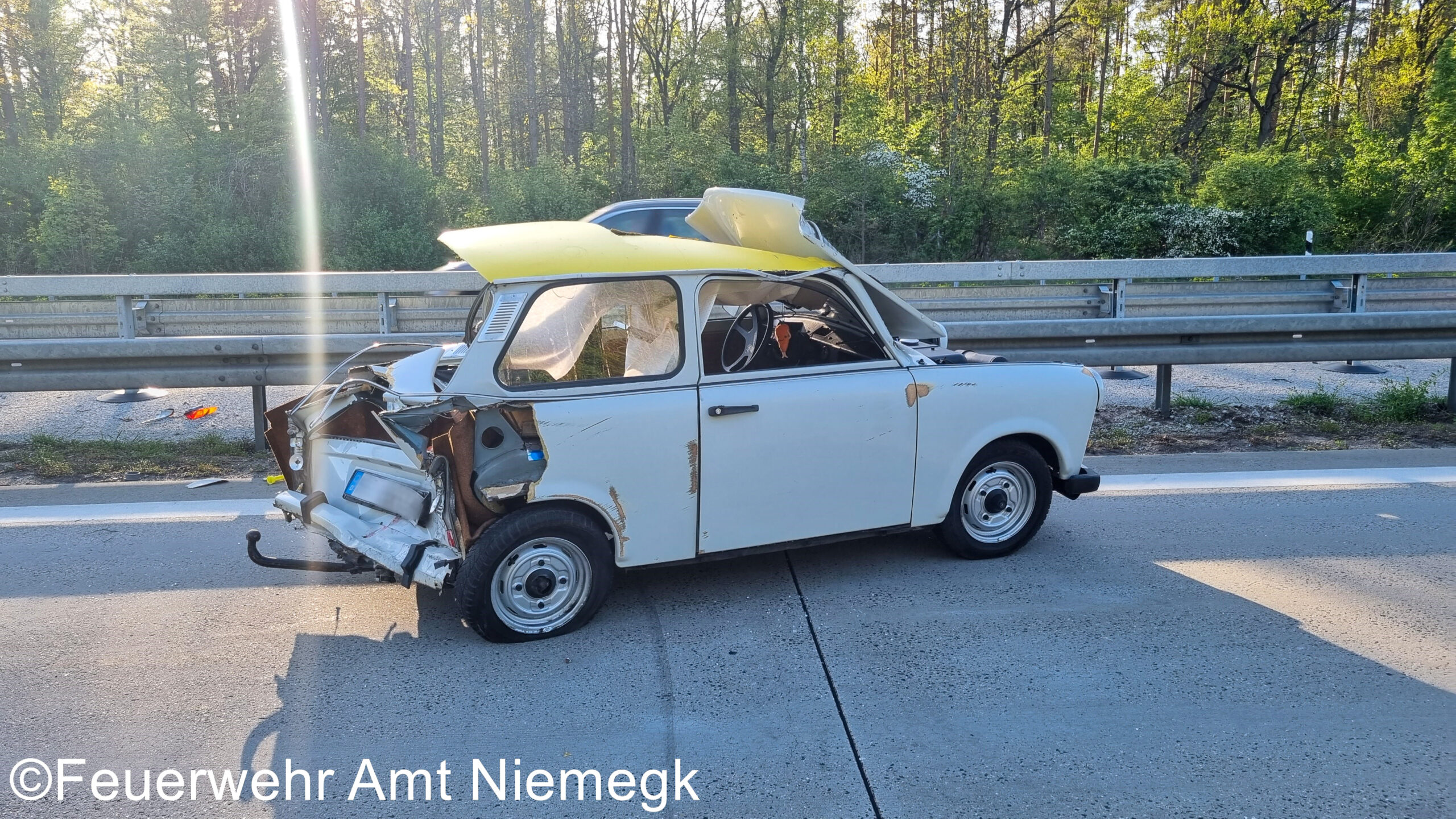 Aus ungeklärter Ursache kollidierte ein PKW mit einem Trabant. Daraufhin überschlug sich der Trabant mehrmals. Die angerückten Einsatzkräfte sicherten die Unfallstelle und haben ausgelaufene Betriebsstoffe gebunden. Da unter anderem ein Rettungshubschrauber im Einsatz war, wurde die BAB 9 Richtung Berlin voll gesperrt.