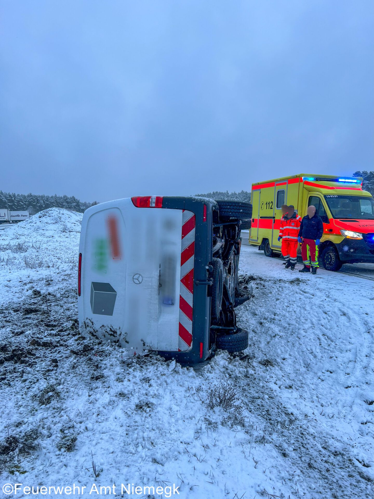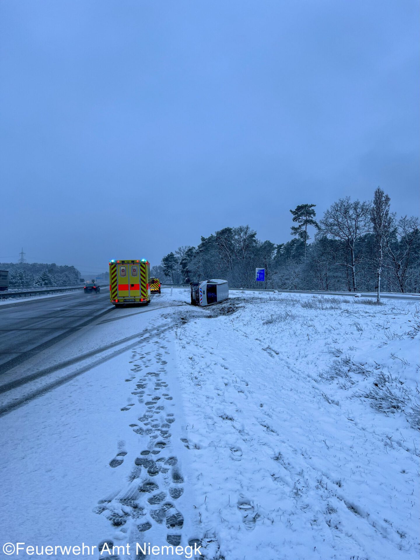 Aufgrund der Witterungsbedingungen verlor der Fahrer eines Kleintransporters die Kontrolle über sein Fahrzeug. Das Fahrzeug überschlug sich und landete auf dem Seitenstreifen der Autobahn. Die angerückten Einsatzkräfte sicherten die Unfallstelle gemeinsam mit der Autobahnpolizei ab.