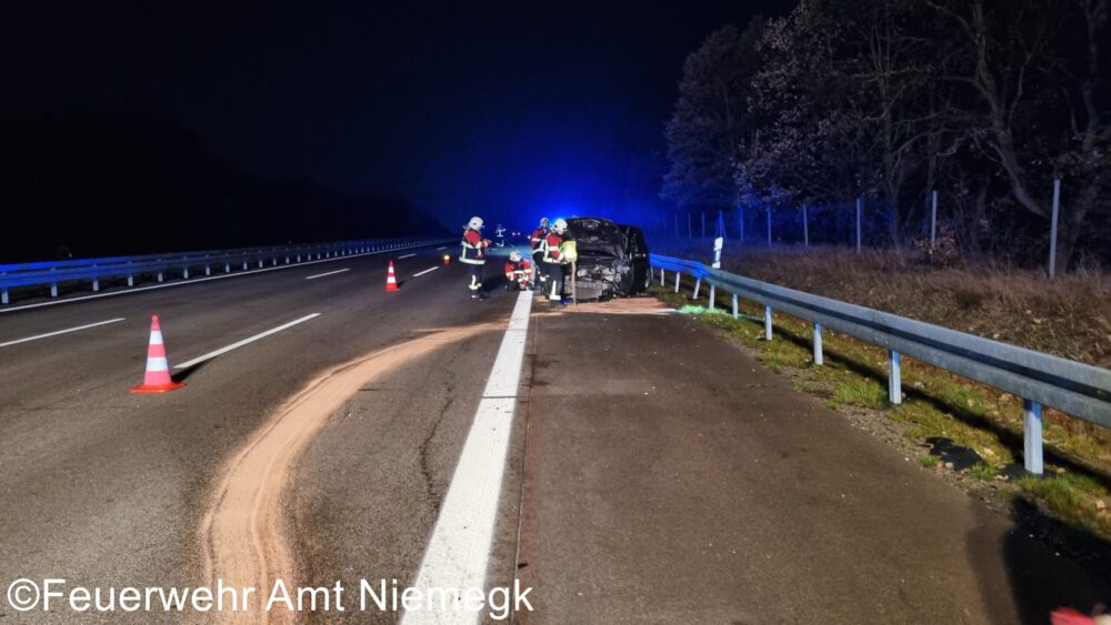 Aus ungeklärter Ursache kollidierte ein PKW mit der Leitplanke. Die Einsatzkräfte sicherten die Unfallstelle und haben ausgelaufene Betriebsstoffe gebunden.