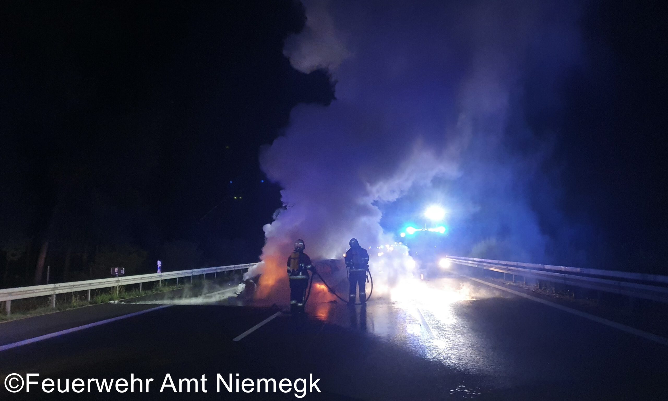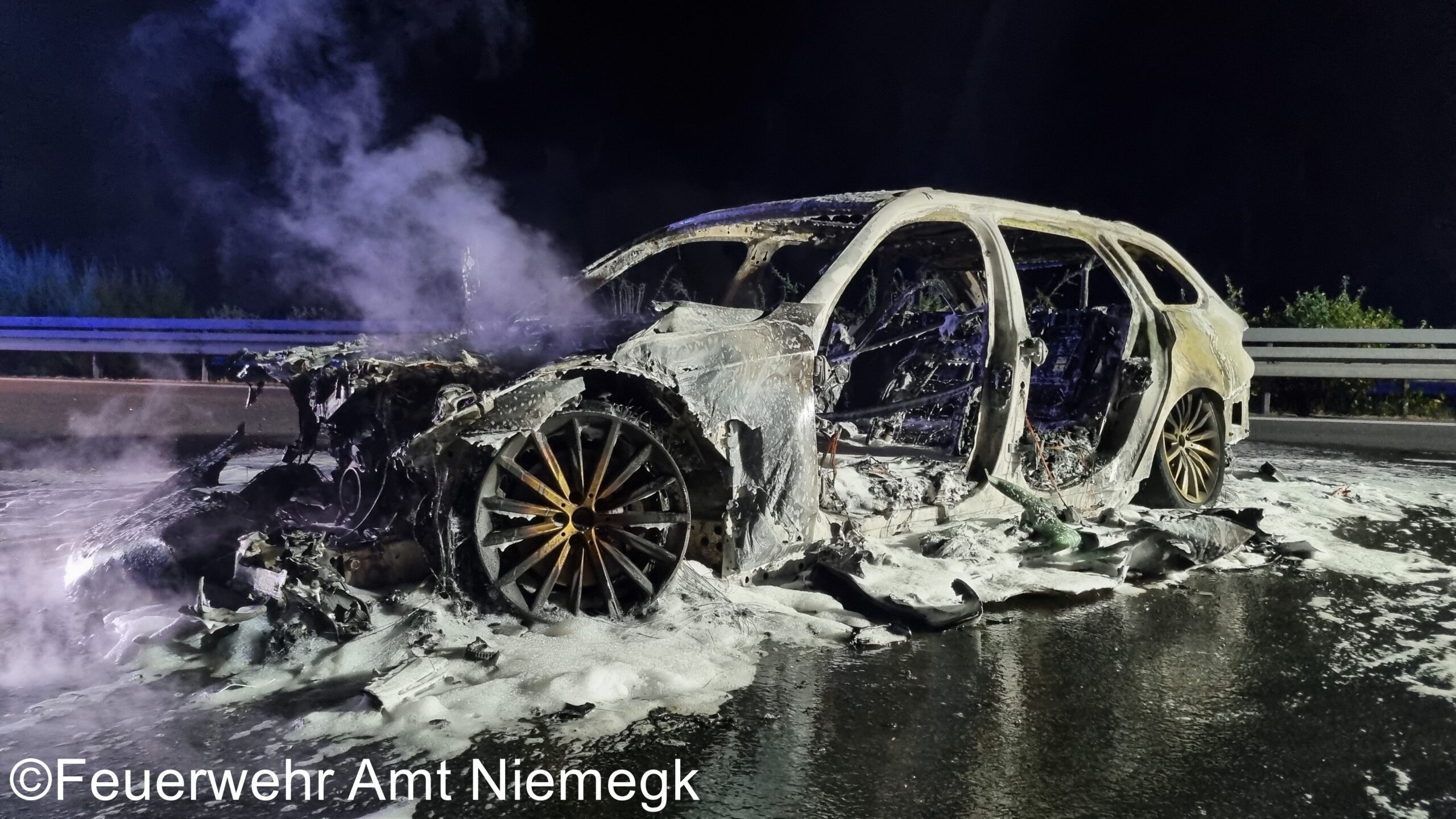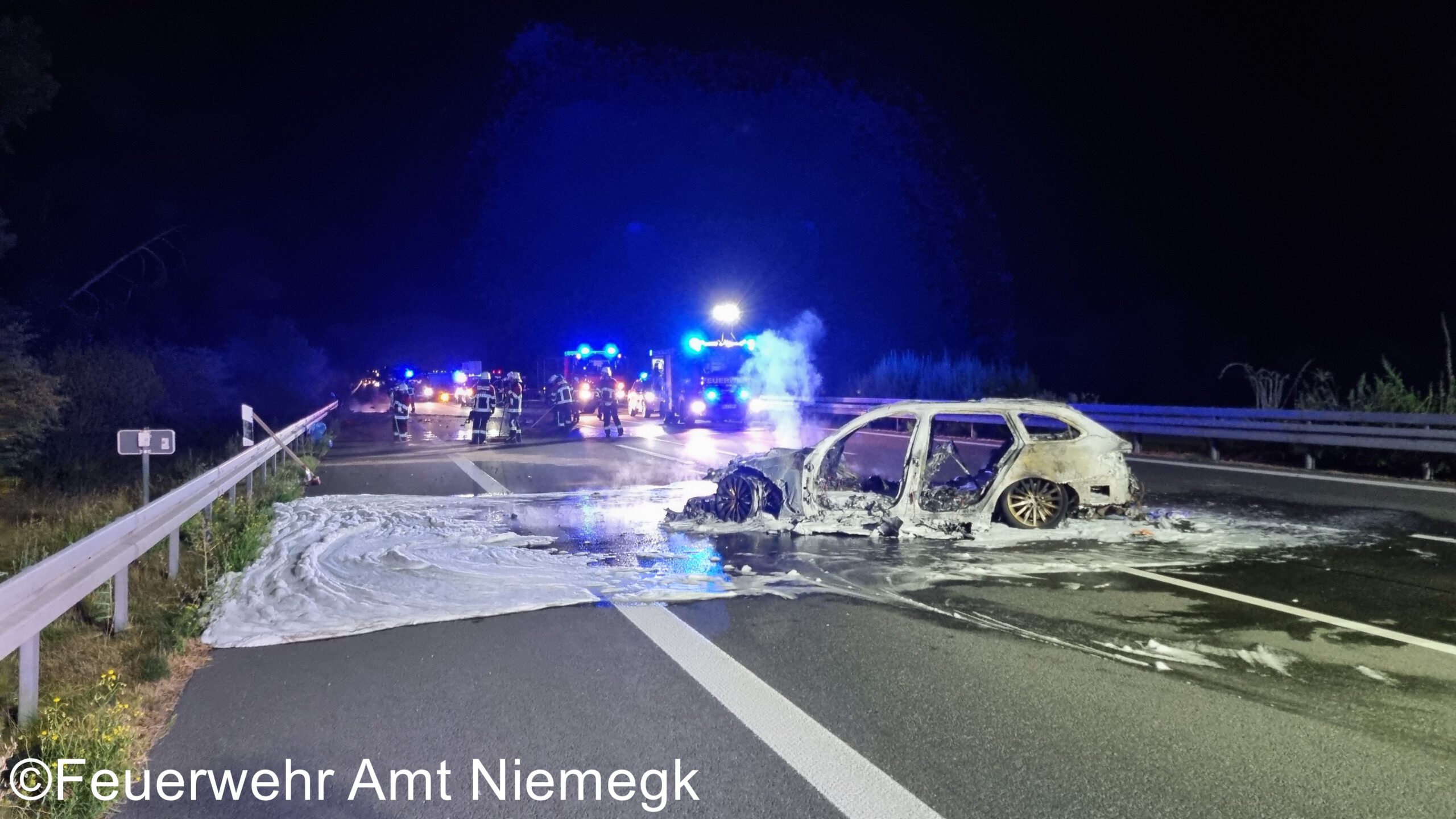 Aus ungeklärter Ursache verlor der Fahrer eines PKW die Kontrolle über sein Fahrzeug und kollidierte mit der Schutzplanke. Das Fahrzeug fing daraufhin Feuer und brannte vollständig aus. Die Einsatzkräfte sicherten die Unfallstelle und führten Löscharbeiten unter Atemschutz durch. Außerdem haben sie ausgelaufene Betriebsstoffe gebunden und die Fahrbahn von Fahrzeugteilen bereinigt. Im Anschluss wurde die Einsatzstelle an die Autobahnpolizei übergeben.