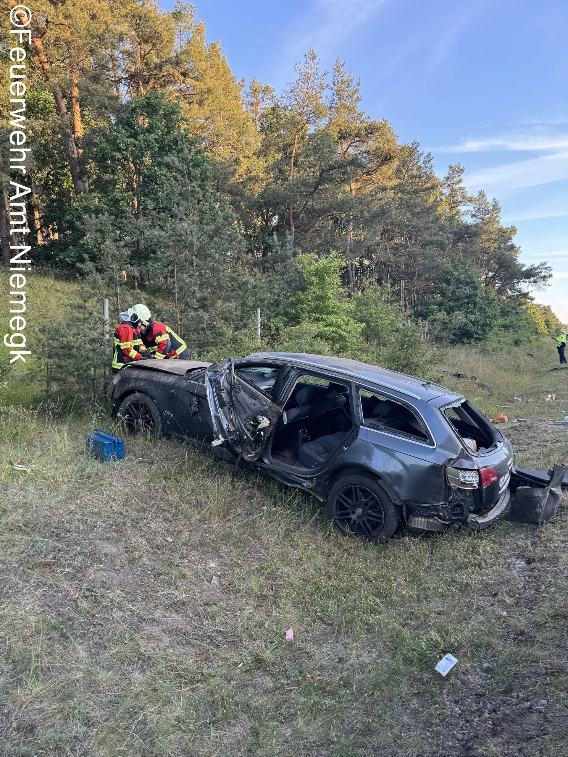 Aus bisher ungeklärter Ursache kam ein PKW von der Fahrbahn ab und überschlug sich. Die alarmierten Einsatzkräfte sicherten die Unfallstelle, stellten den Brandschutz sicher und klemmten die Fahrzeugbatterie ab. Da zwei Rettungshubschrauber zum Einsatz kamen, wurde die BAB9 Richtung Berlin voll gesperrt. Im Anschluss wurde die Einsatzstelle an die Polizei übergeben.