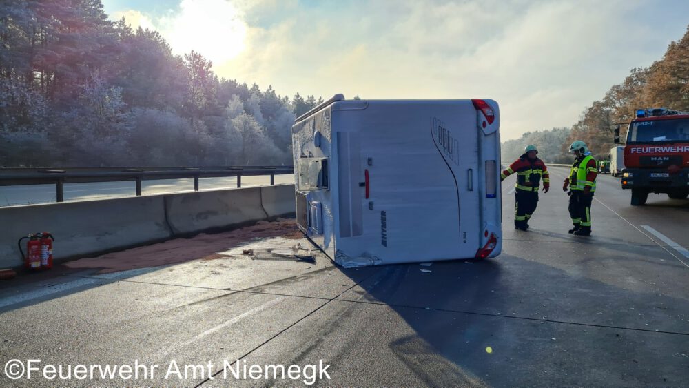 Aus ungeklärter Ursache kollidierte eine Wohnwagen mit einer Betonwand. Daraufhin kippte das Fahrzeug auf die Seite. Die angerückten Einsatzkräfte sicherten die Unfallstelle und haben ausgelaufene Betriebsstoffe gebunden. Außerdem führte der Wohnwagen zwei Gasflaschen mit, die durch die Einsatzkräfte gesichert wurden. Mithilfe einer Seilwinde wurde das Fahrzeug anschließend wieder aufgerichtet.