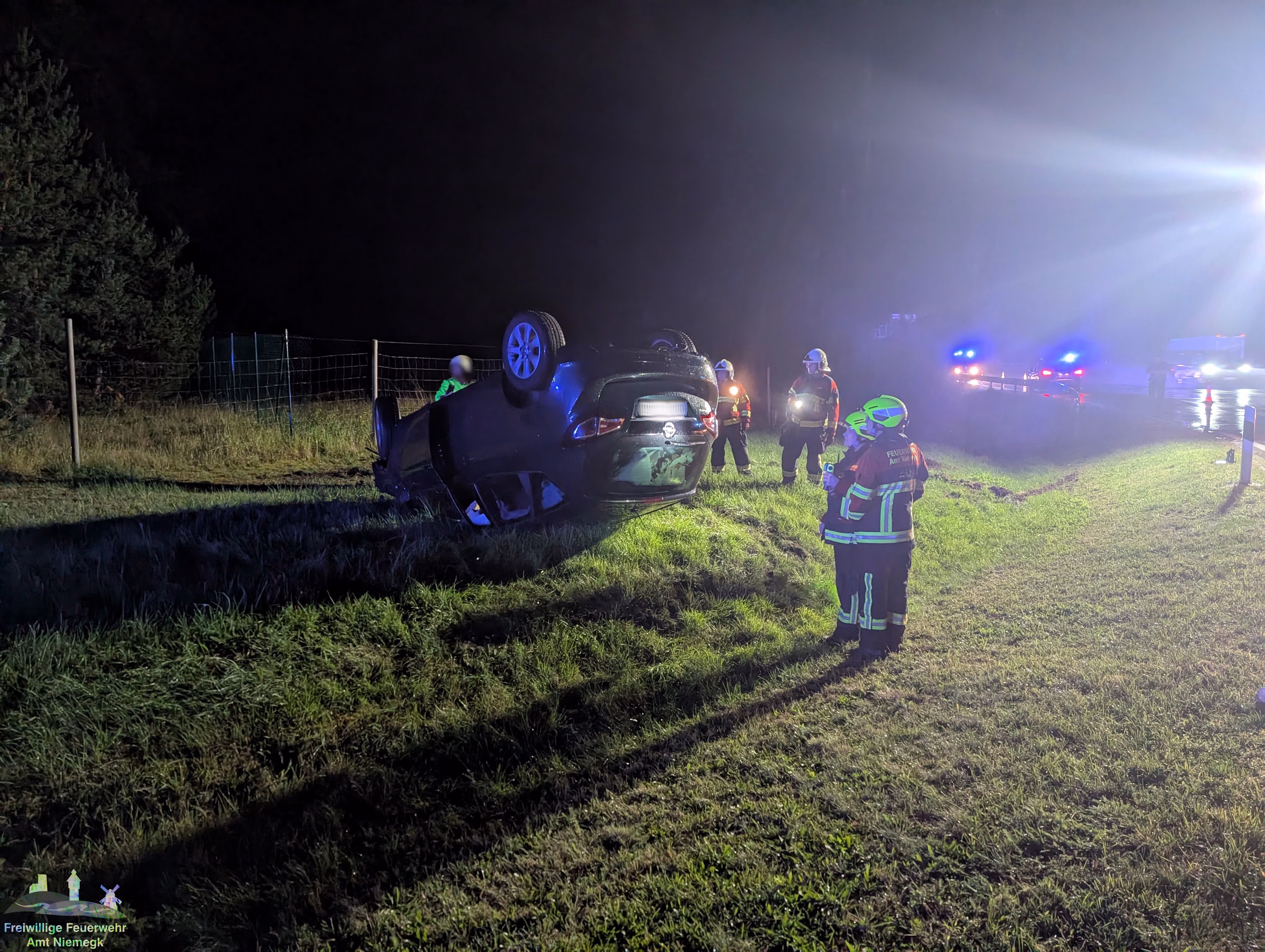 Wir wurden zu einem überschlagenden PKW auf der BAB9 alarmiert. Vor Ort hatte ein PKW aus bislang ungeklärter Ursache die Kontrolle verloren und überschlug sich seitlich in den Straßengraben. Durch das Sperren der Autobahn durch die Polizei konnten wir entgegen der Fahrtrichtung auf die Autobahn auffahren. Wir betreuten zusammen mit dem Rettungsdienst die Patient*innen und übergaben diese an den Rettungsdienst. Nach dem abklemmen der Batterie übergaben wir die Einsatzstelle an die Autobahnpolizei.
