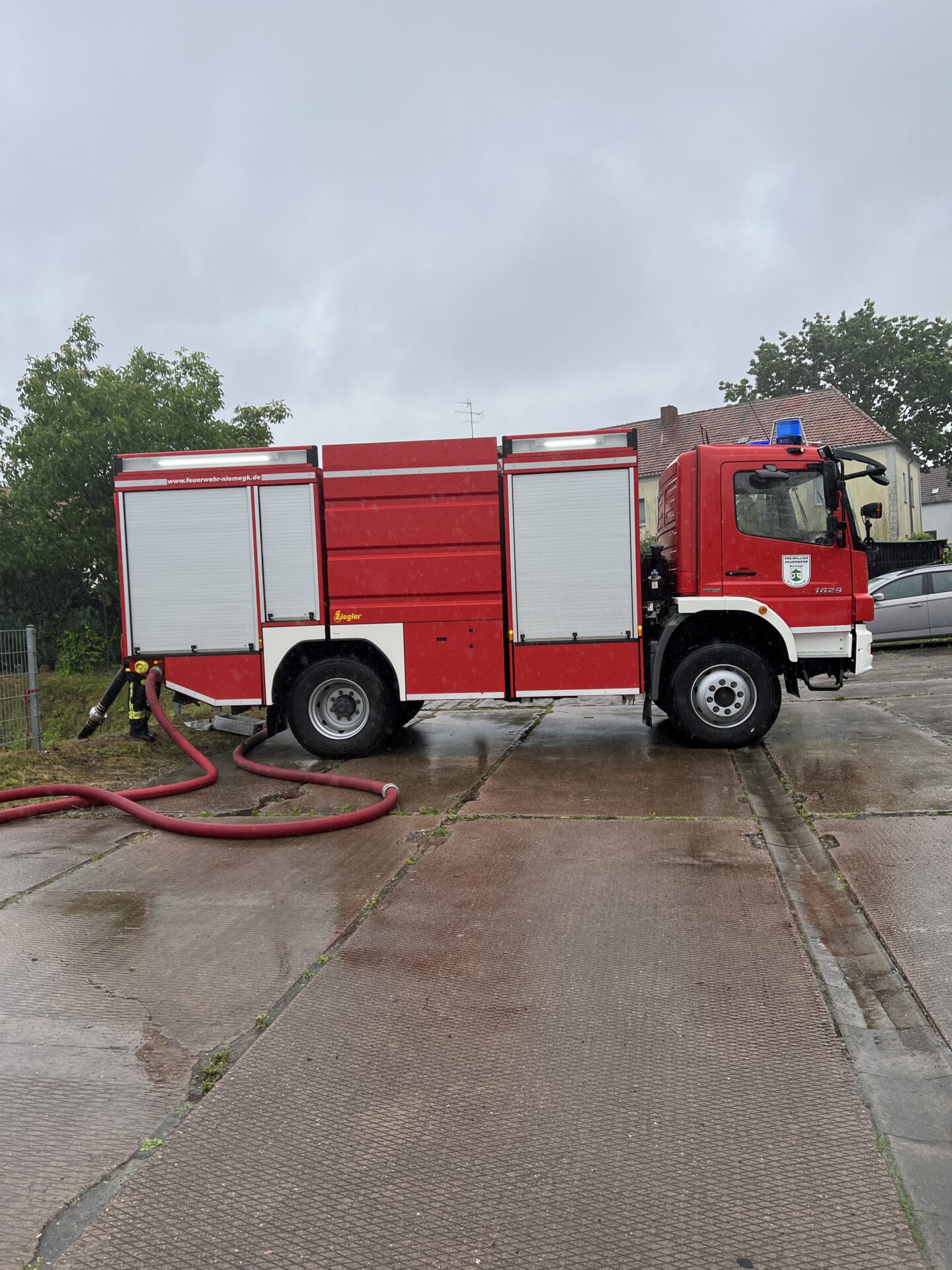 Aufgrund der starken und lang anhaltenden Regenfälle lief das Regenwasser in die Hallen der Abfallwirtschaft. Die Feuerwehr pumpte die Auffanganlage aus und führte das Wasser ab.