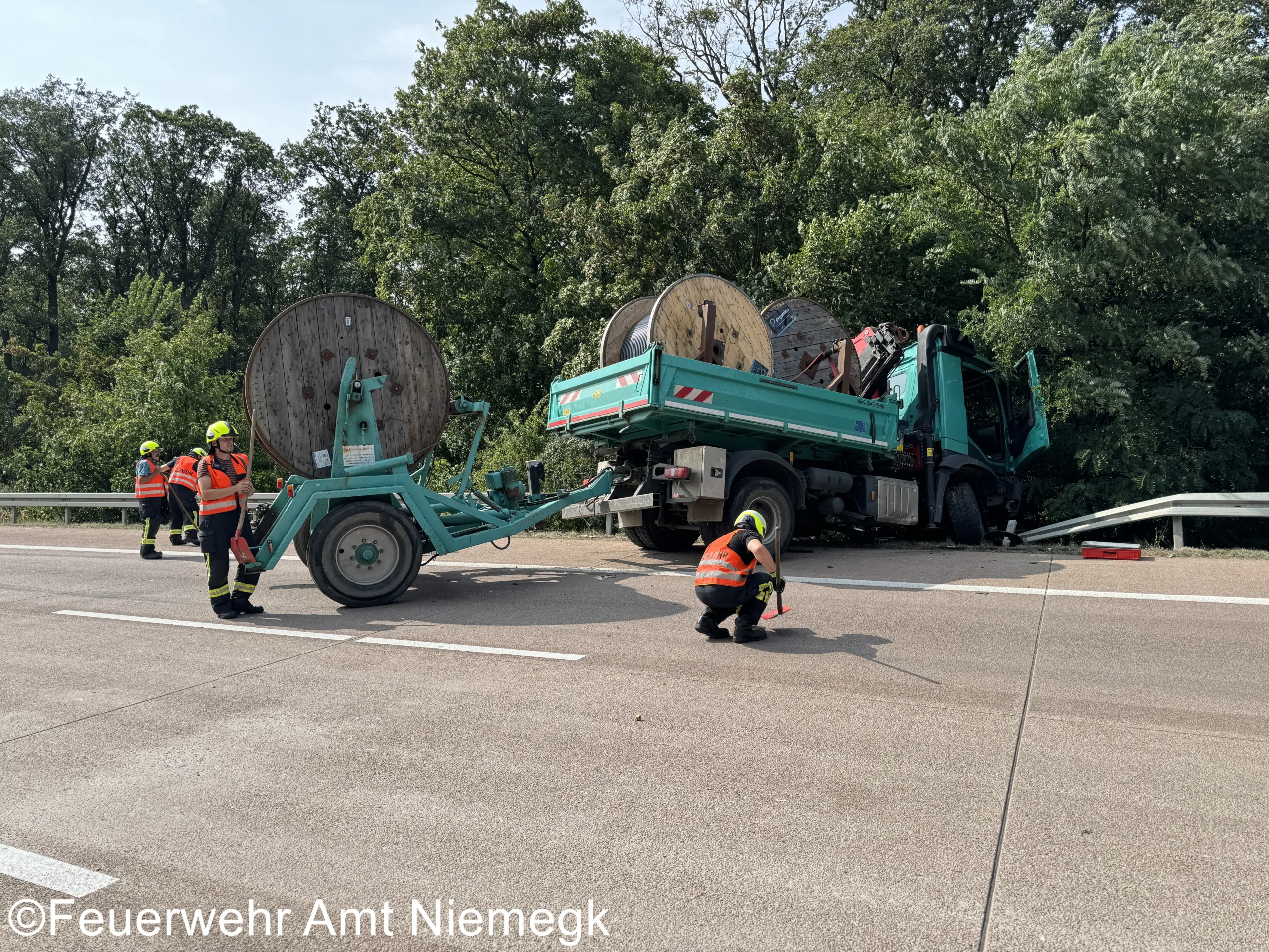 Aufgrund eines Reifenschadens verlor der Fahrer eines LKW die Kontrolle über sein Fahrzeug. Die alarmierten Einsatzkräfte sicherten die Unfallstelle und reinigten die Fahrbahn von Fahrzeugteilen. Im Anschluss wurde die Unfallstelle an die Autobahnmeisterei und die Polizei übergeben.