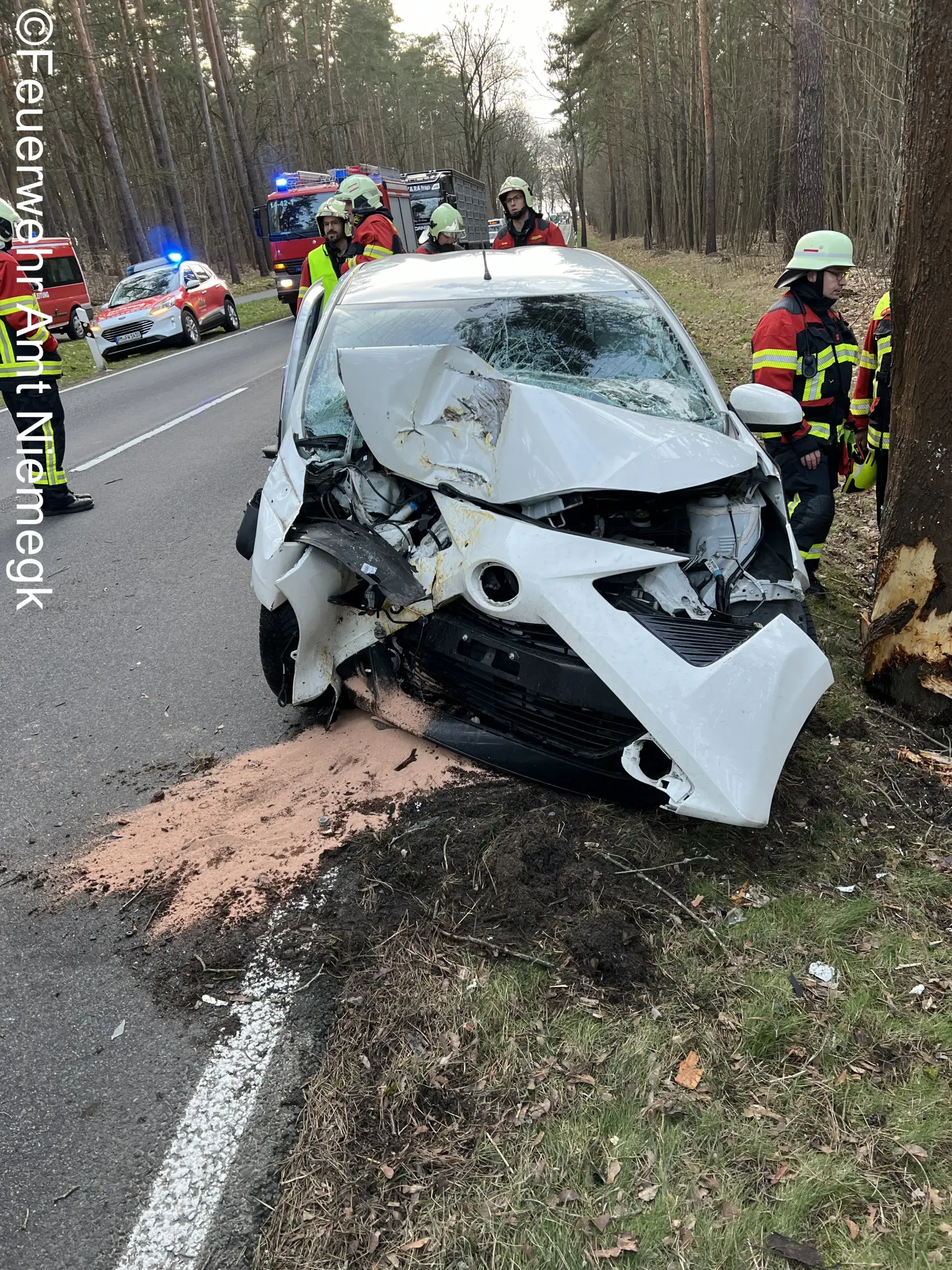 Aus bisher ungeklärter Ursache kam ein PKW von der Fahrbahn ab und kollidierte mit einem Baum. Die alarmierten Einsatzkräfte sicherten die Unfallstelle, halfen bei der Patientenbetreuung und banden ausgelaufene Betriebsstoffe.