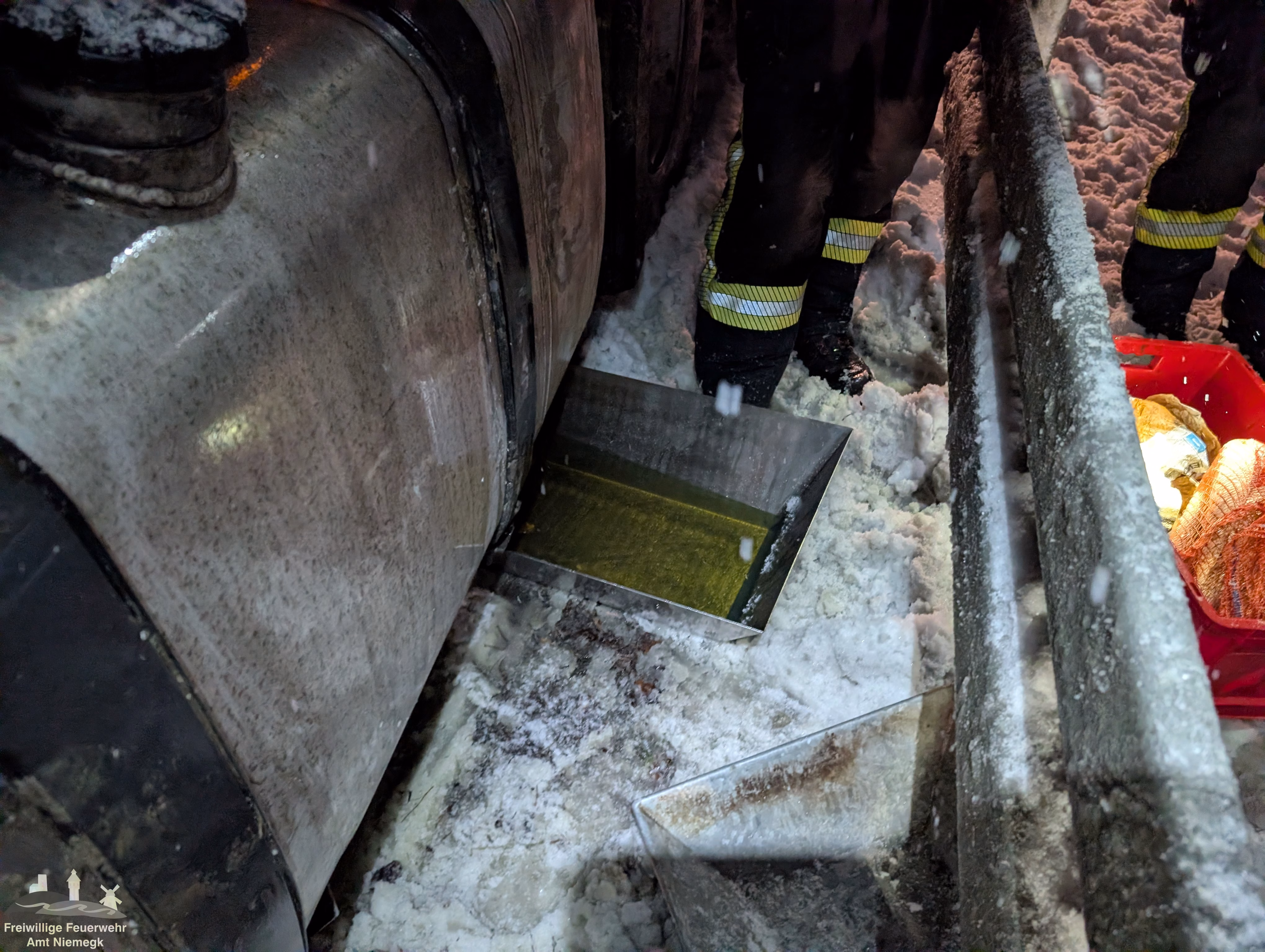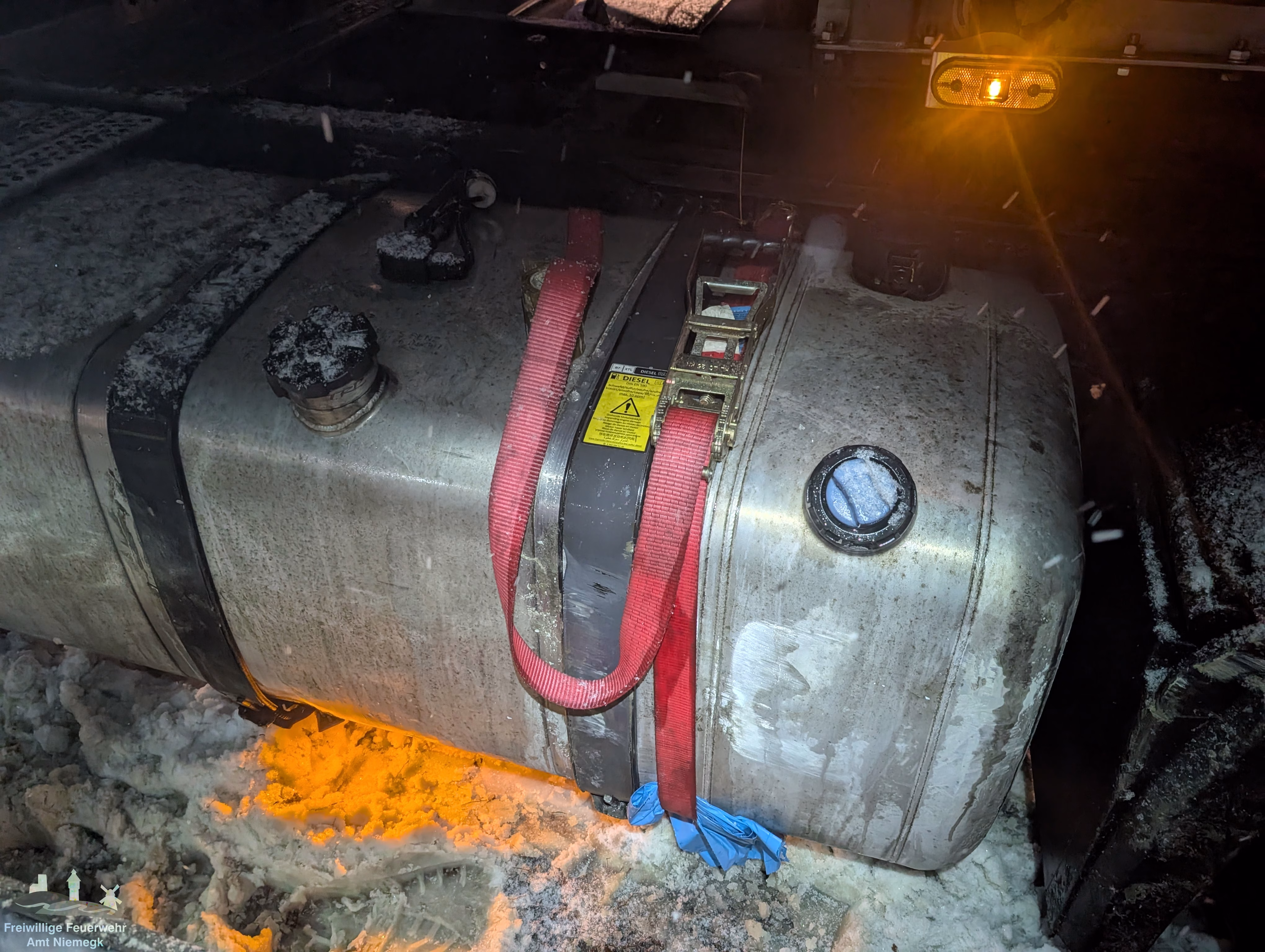 Wir wurden zu auslaufenden Betriebsstoffen aus einem LKW alarmiert. Vor Ort bestätigte sich die gemeldete Lage. Aus ungeklärter Ursache verlor ein LKW die Kontrolle und es trat Diesel aus dem Tank eines LKW aus und verunreinigte die Fahrbahn. Die Einsatzstelle wurde abgesichert und der Brandschutz sichergestellt. Mit Ausrüstung aus dem Rüstwagen konnte das Leck am Tank provisorisch abgedichtet werden. Die ausgelaufenen Betriebsstoffe wurden aufgenommen und die Fahrbahn anschließend gereinigt. Abschließend wurde die Einsatzstelle an die Polizei übergeben und wir konnten wieder einrücken.