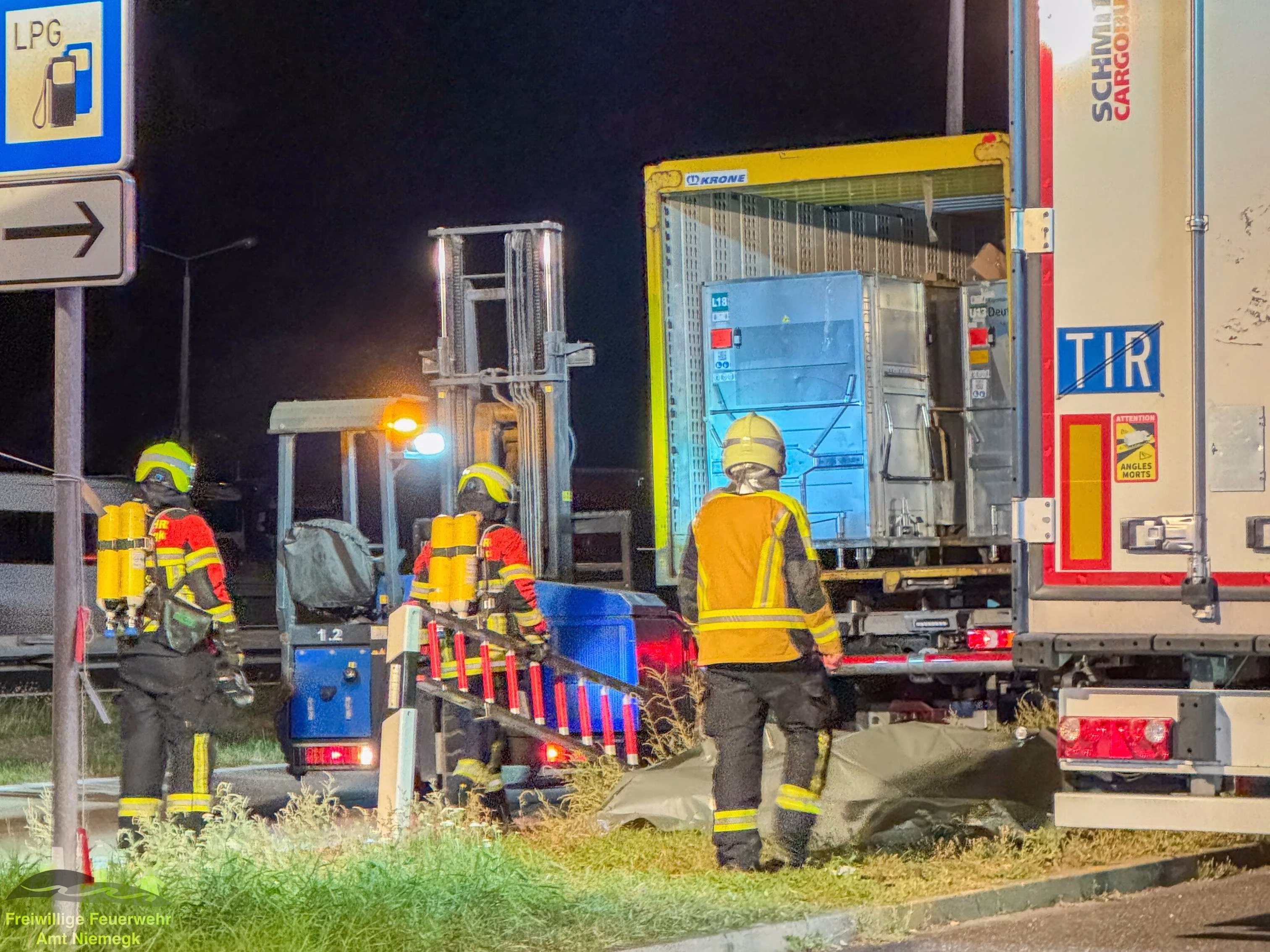 Die Einsatzkräfte wurden zu einem LKW alarmiert, aus dem eine unbekannte Flüssigkeit austrat. Da zunächst nicht ausgeschlossen werden konnte, dass es sich um einen Gefahrstoff handelt, wurde zusätzlich die Gefahrstoffeinheit, die für solche Lagen speziell ausgebildet ist, alarmiert.