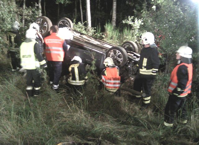 Ein Opel-PKW kam von der Autobahn ab, überschlug sich und schleuderte in den angrenzenden Grünstreifen. Während der Fahrer selbst das Fahrzeug verlassen konnte, wurde eine Frau in dem Wrack eingeklemmt und musste von der Feuerwehr befreit werden. Beide Insassen kamen mit Verletzungen in ein Krankenhaus.