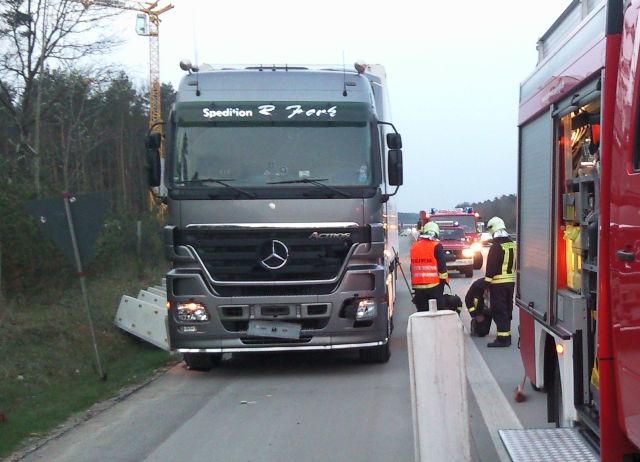 Erneut hatte sich ein LKW mit Sattelanhänger an einer Beton-Baustellenabsperrung die Dieselleitung abgerissen.